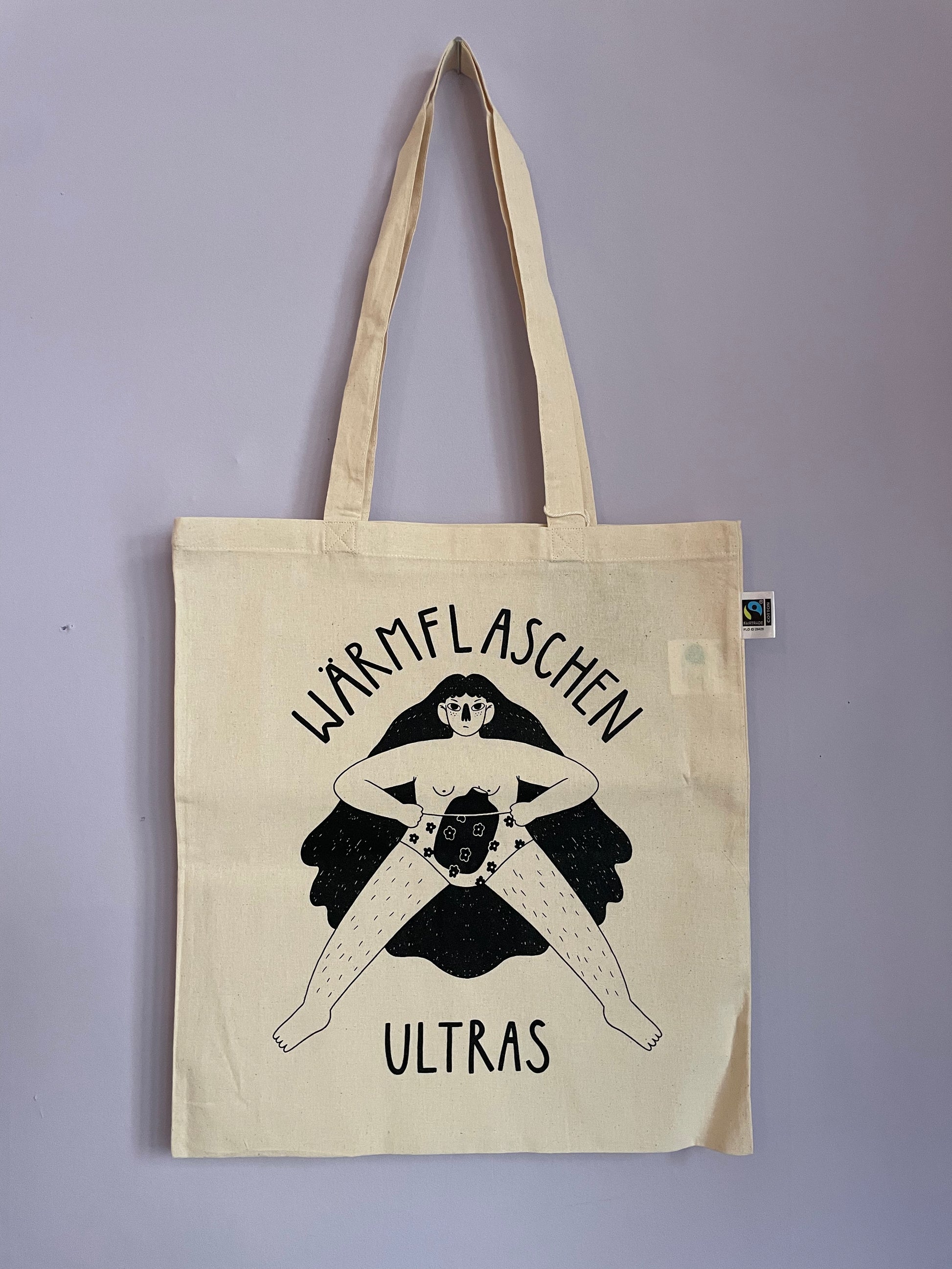 Die Tasche ist aus 100% Fairtrade Bio-Baumwolle und hat einen langen Henkel. Der Druck ist schwarz auf dem weißen Beutel.