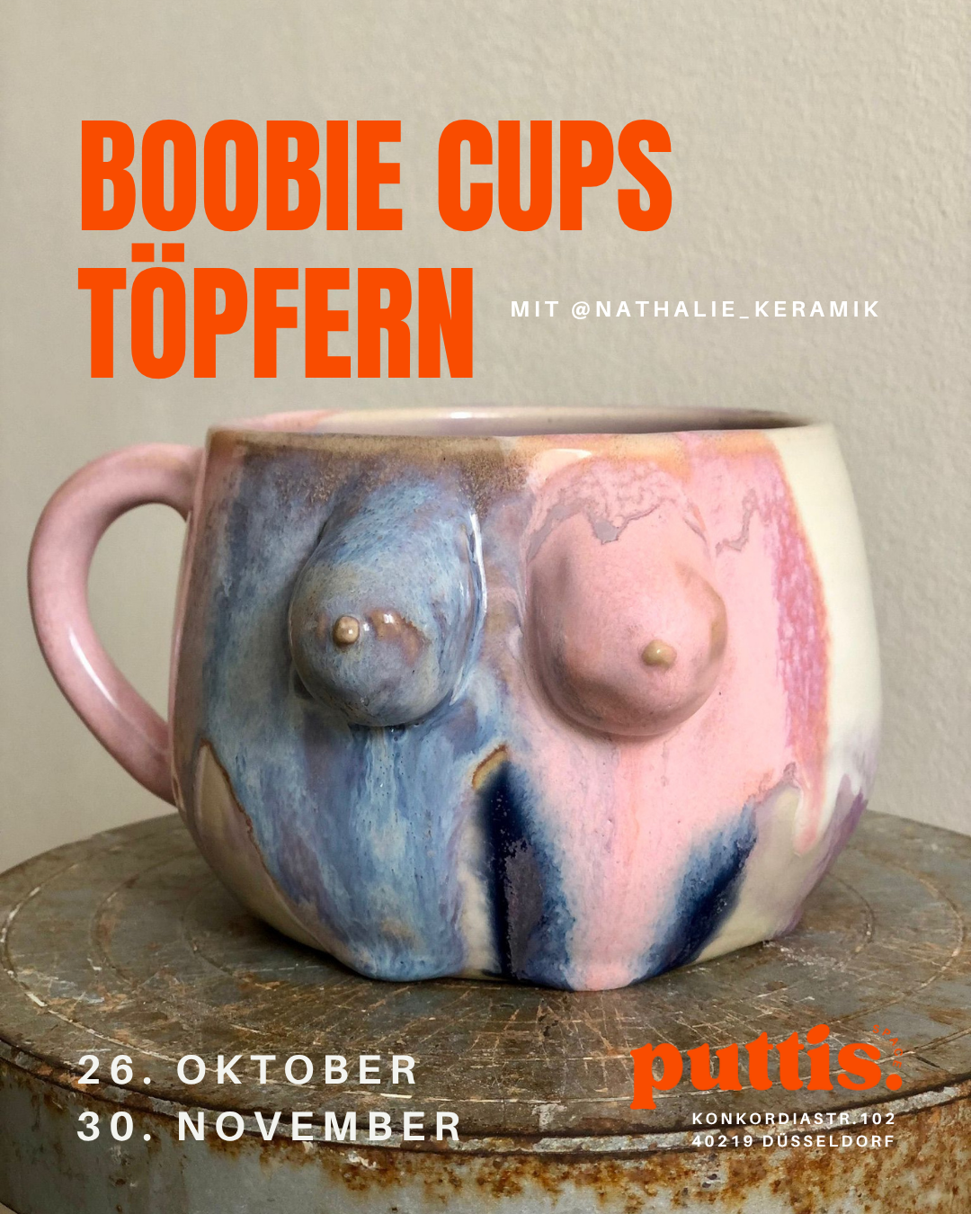 Töpfern, quatschen, lachen – und am Ende eine ganz persönliche Tasse in den Händen halten: In diesem Workshop gestaltest du per Handaufbautechnik deine eigene Boobie-Cup – eine Tasse mit Brüsten, ganz nach deinen Vorstellungen.